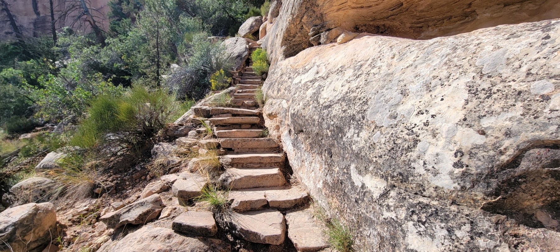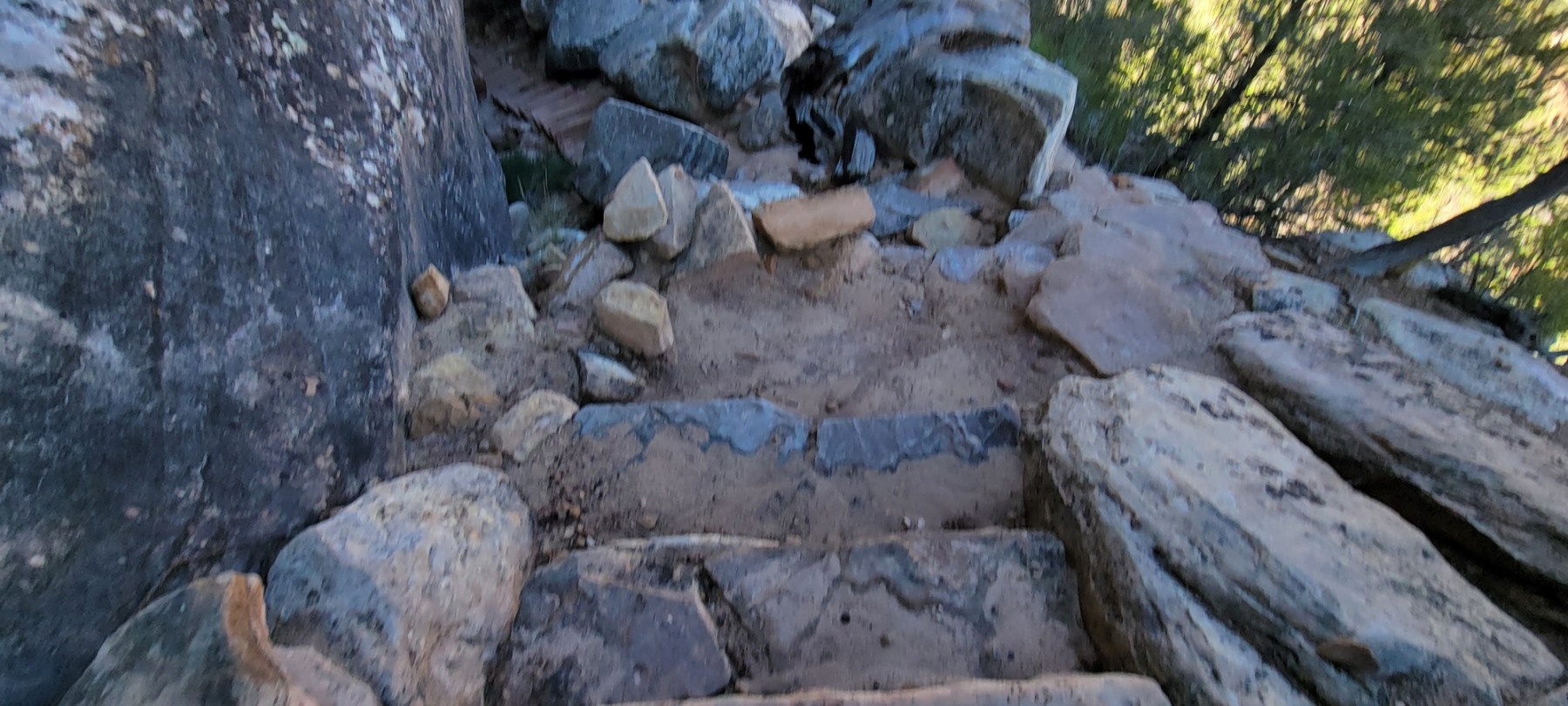 The trail descends rather quickly with the help of a steel staircase that is bolted to the rock. Then a little further down the trail it descends even quicker with a vertical ladder that is attached to the rock. Between these steel steps, the rock is shaped into large steps that are intertwined with sandy dirt patches. Green trees and bushes grow just off the trail. Just tall enough to obscure some views but not quite tall enough to cast any useful shade.
