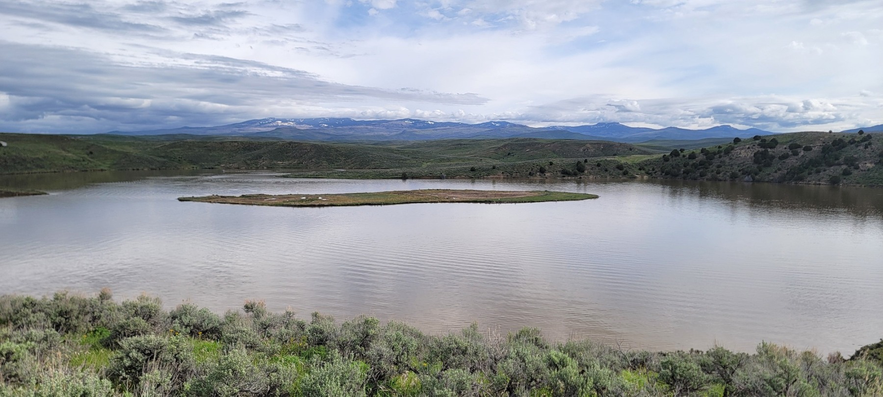 Elkhead Reservoir isn’t too big so I could see across it for most of the hike. I alternated between some of the early budding flowers and glances back to the water to watch the clouds move in. The trail itself is narrow and a little overgrown. This park is more about water activities and I don’t think hiking is top on its list but the trail was still enjoyable. About a mile into the hike, the trail starts its switchback up to the top of the main hill overlooking the water. At this point the reservoir also extends a bit and shows off a small island in the middle. The hill is also where you get your steepest elevation gains of the hike.