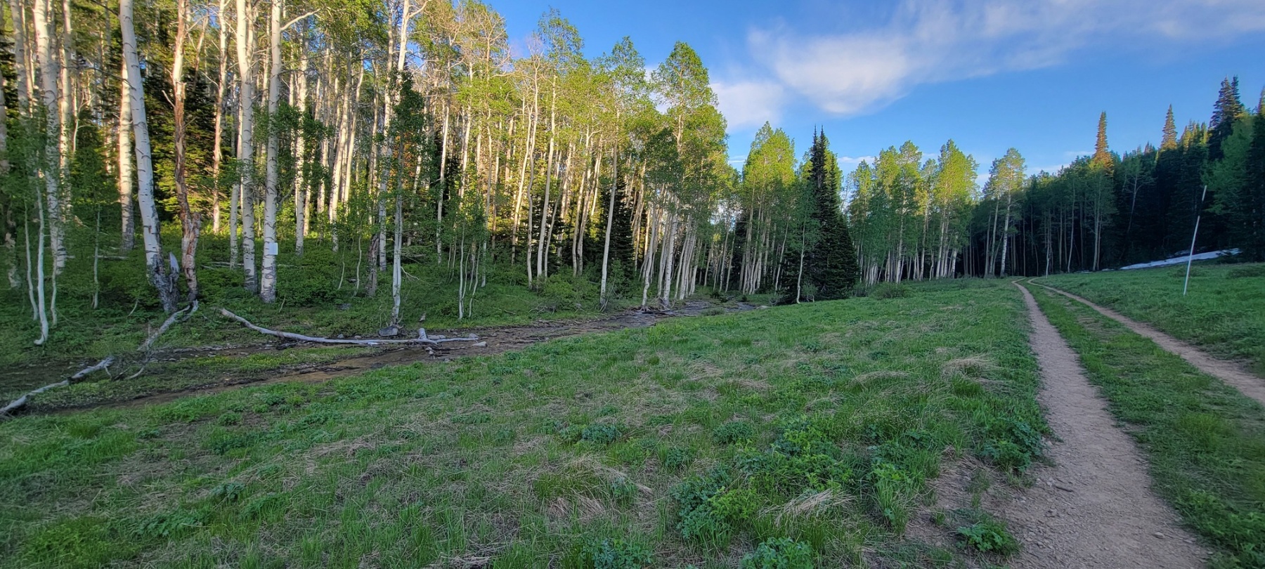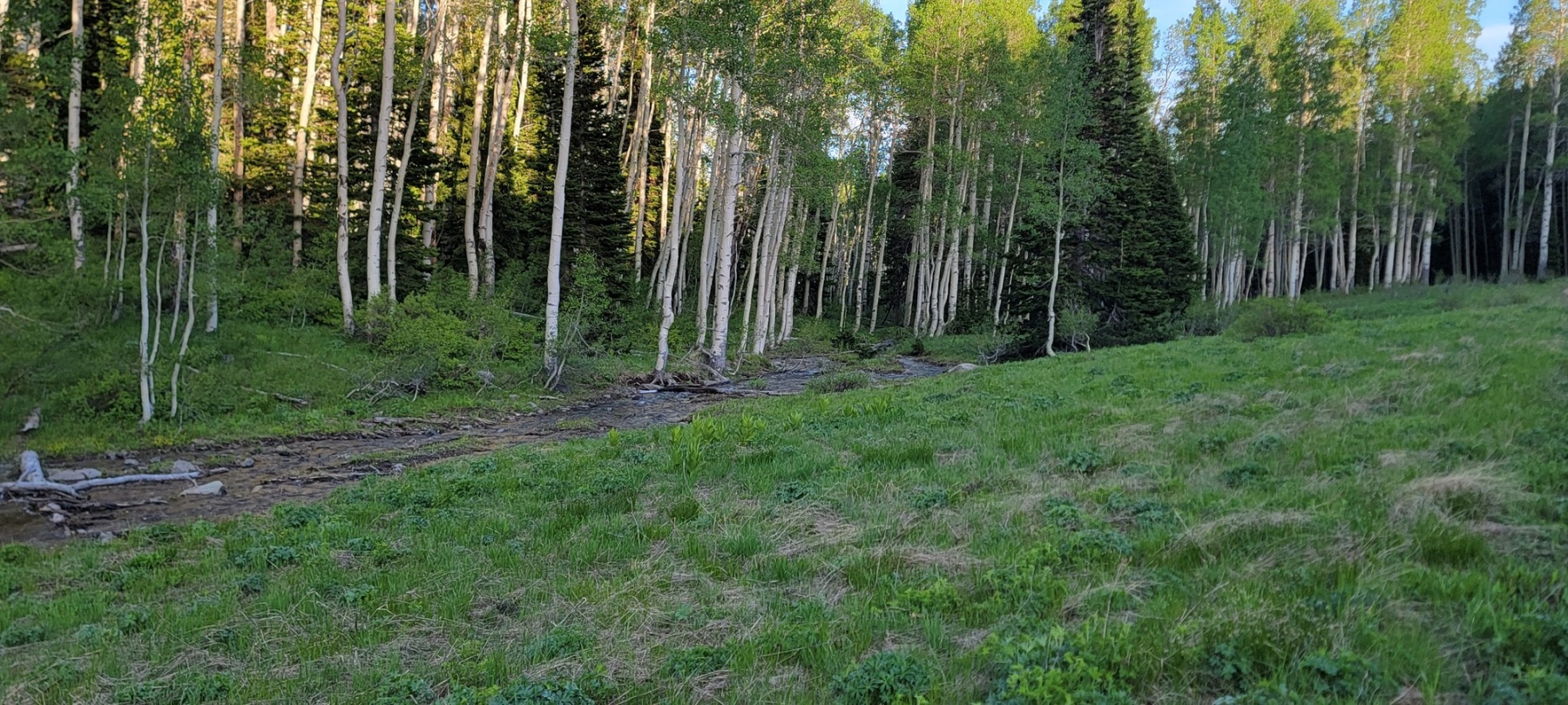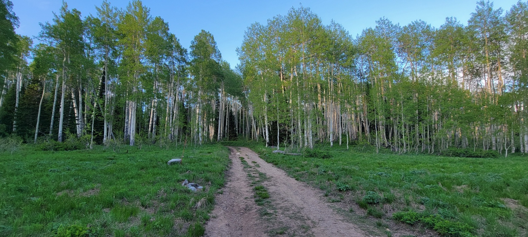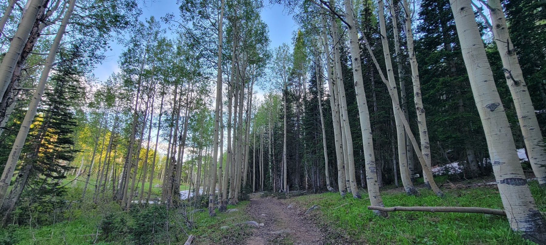 In mid-June the creek was full but still on a few inches deep. The water was amazing while it was reflecting the setting sun and surrounded by Aspen trees. It was such a pretty spot! As you head to the south you will follow the creek for about a third of a mile and have to do a couple of crossings depending on how high the water is. The second crossing is in the middle of Aspen grove. At that point you can continue to the south for another trail or cross and head through the trees to finish the loop.