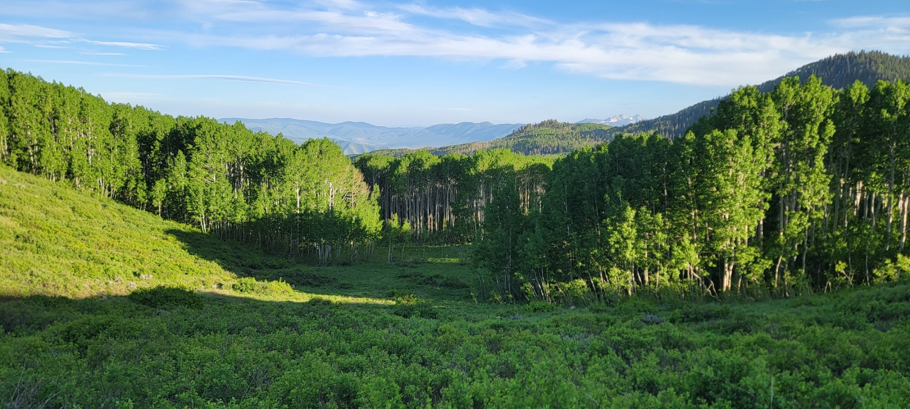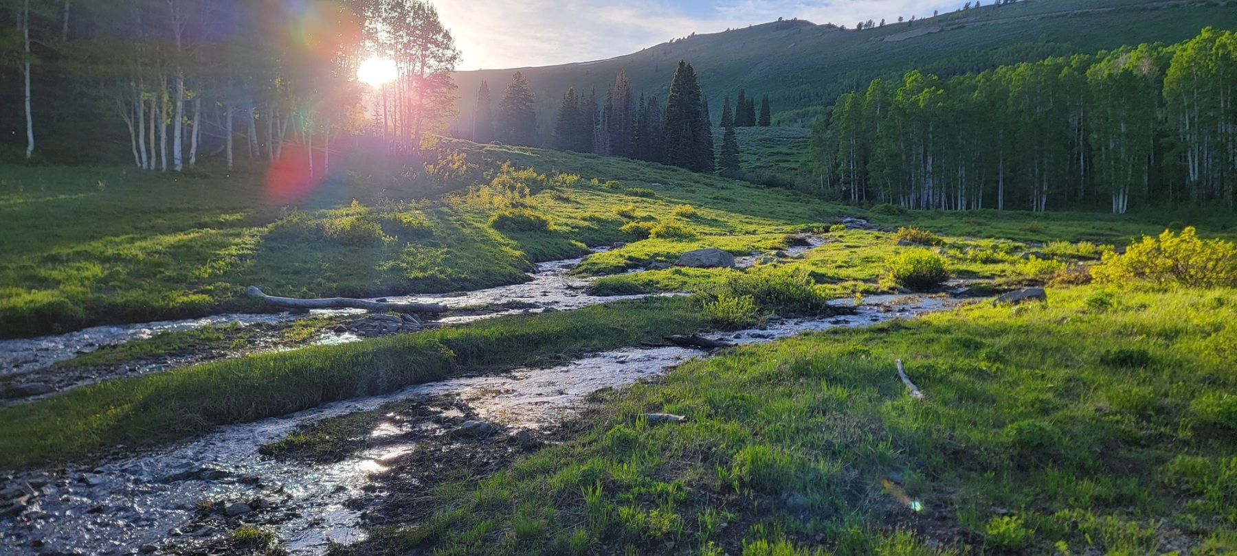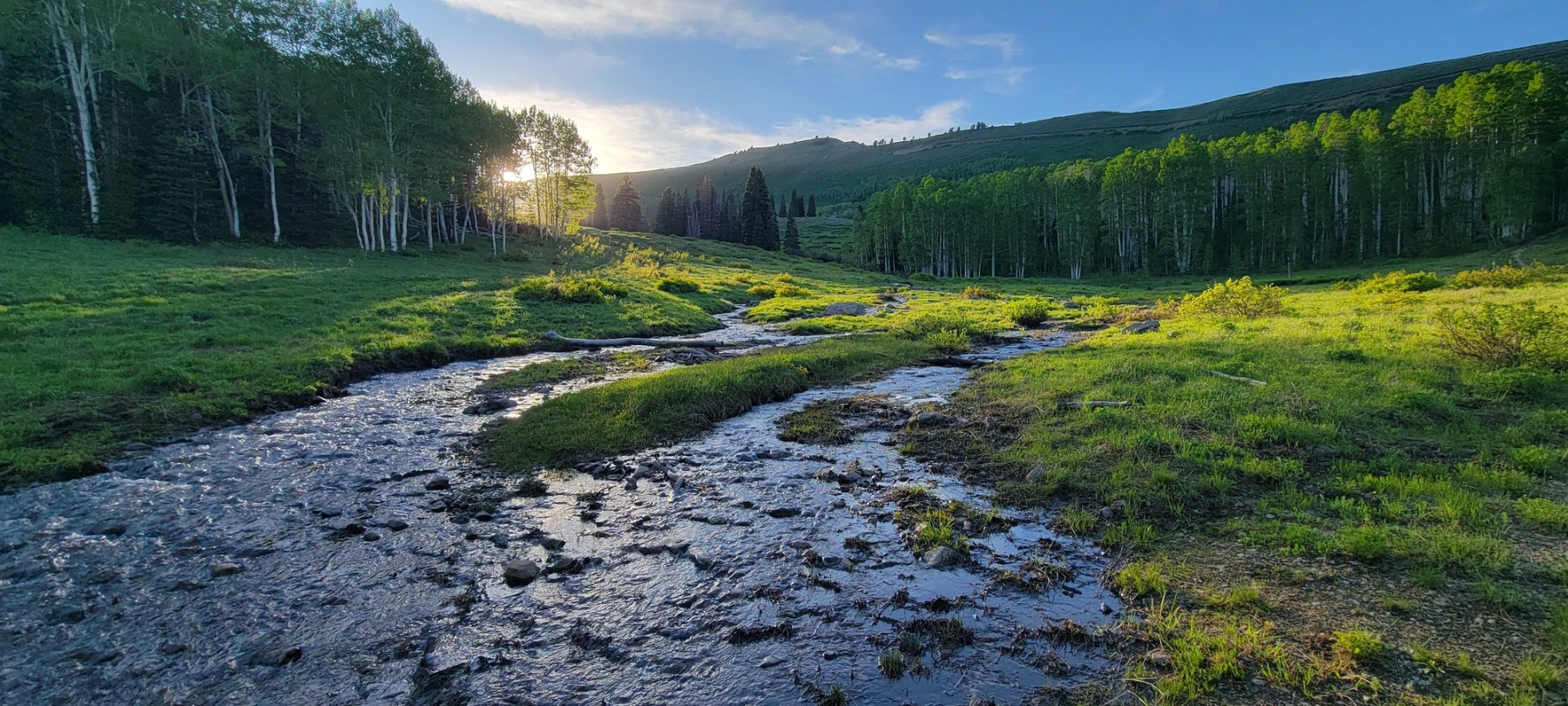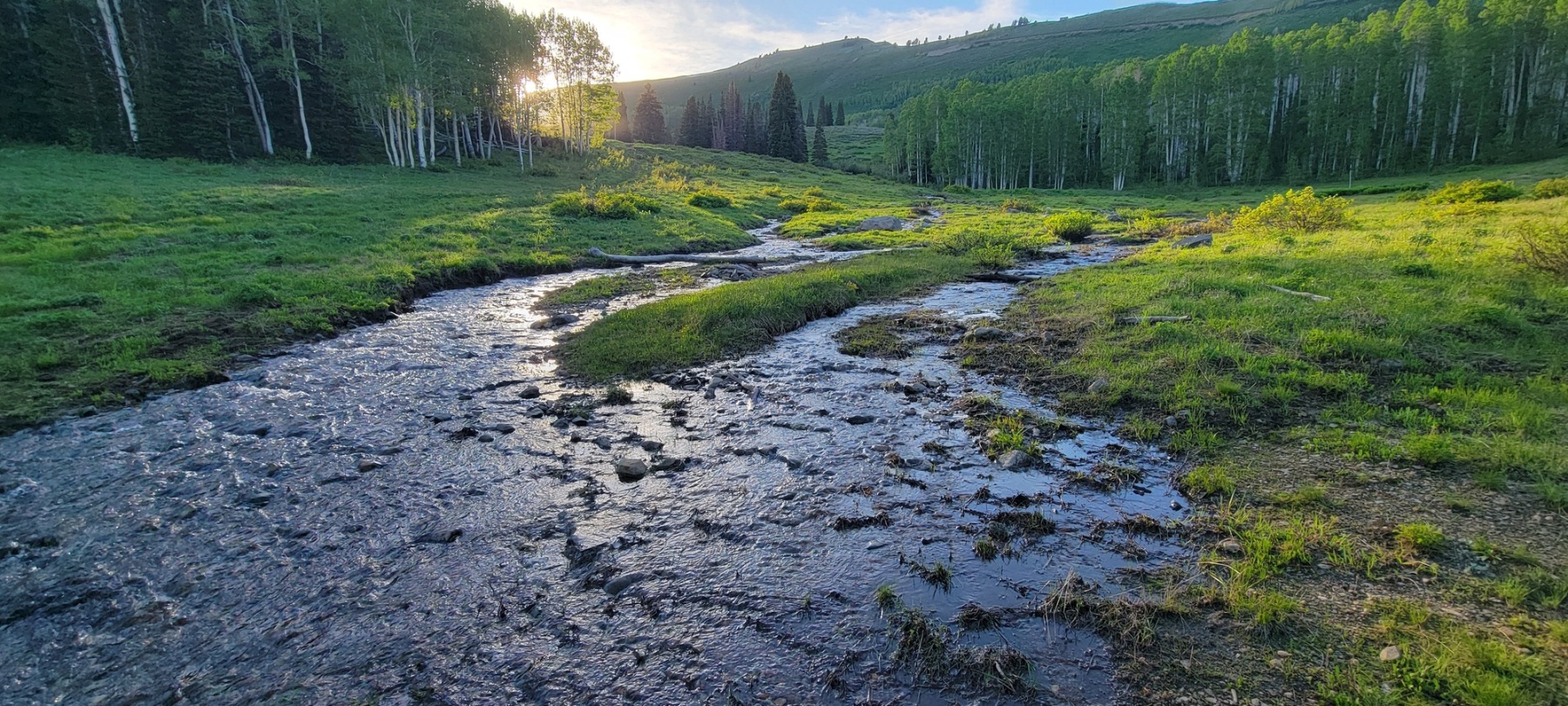 In mid-June the creek was full but still on a few inches deep. The water was amazing while it was reflecting the setting sun and surrounded by Aspen trees. It was such a pretty spot! As you head to the south you will follow the creek for about a third of a mile and have to do a couple of crossings depending on how high the water is. The second crossing is in the middle of Aspen grove. At that point you can continue to the south for another trail or cross and head through the trees to finish the loop.