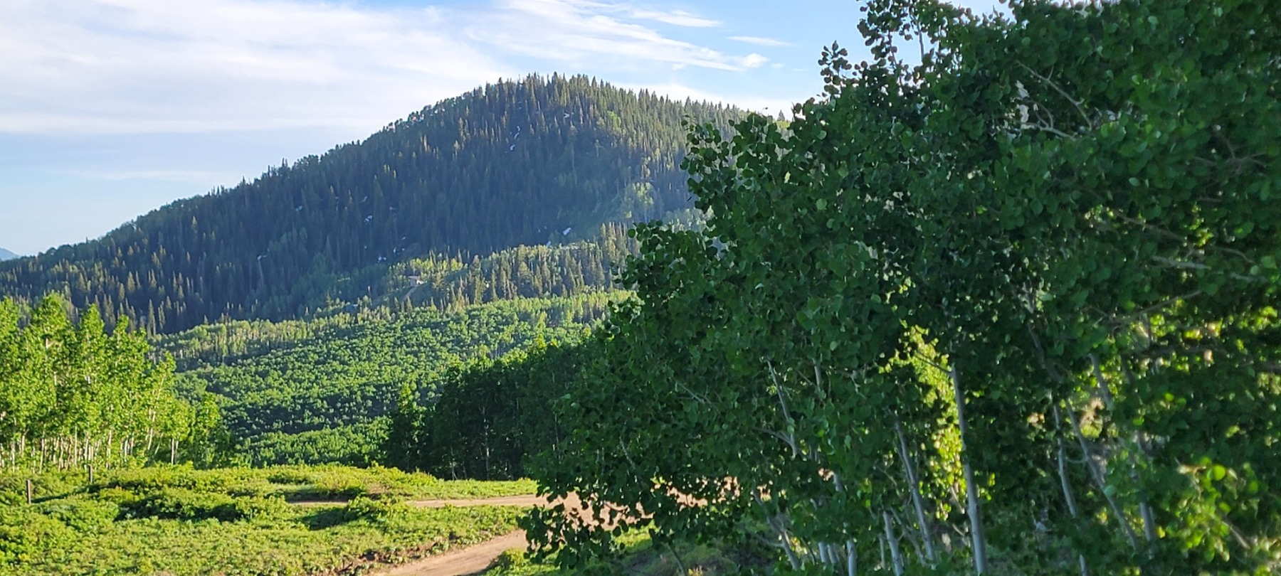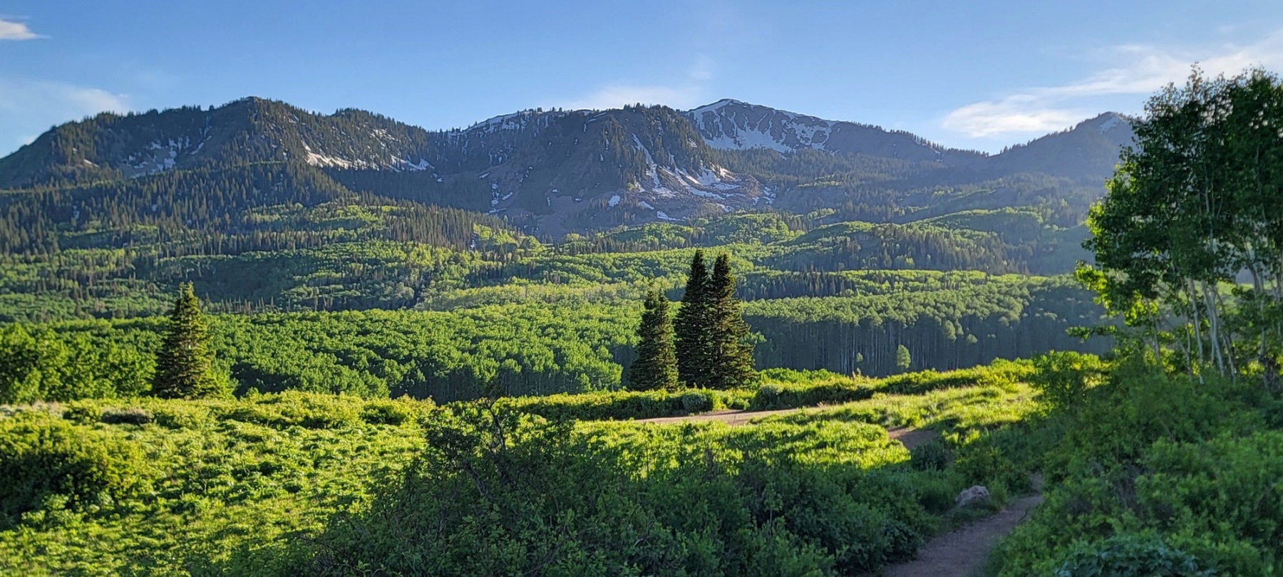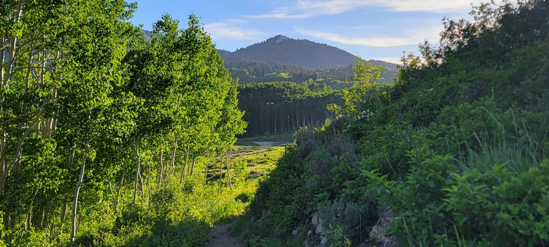 The Hoss Trailhead is the first parking lot after clearing the pass from the Winter Park side of Guardsman Pass. There are some really great views from the lot and in the early summer the countryside was a bright green. The Hoss trail starts from the parking lot and then connects to several trails in the complex. It starts on the west side of the parking lot.