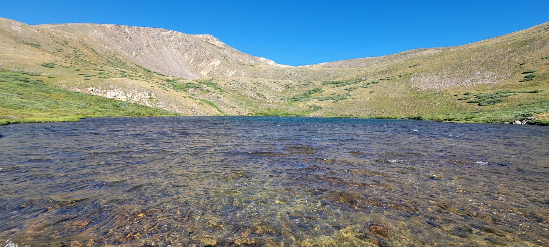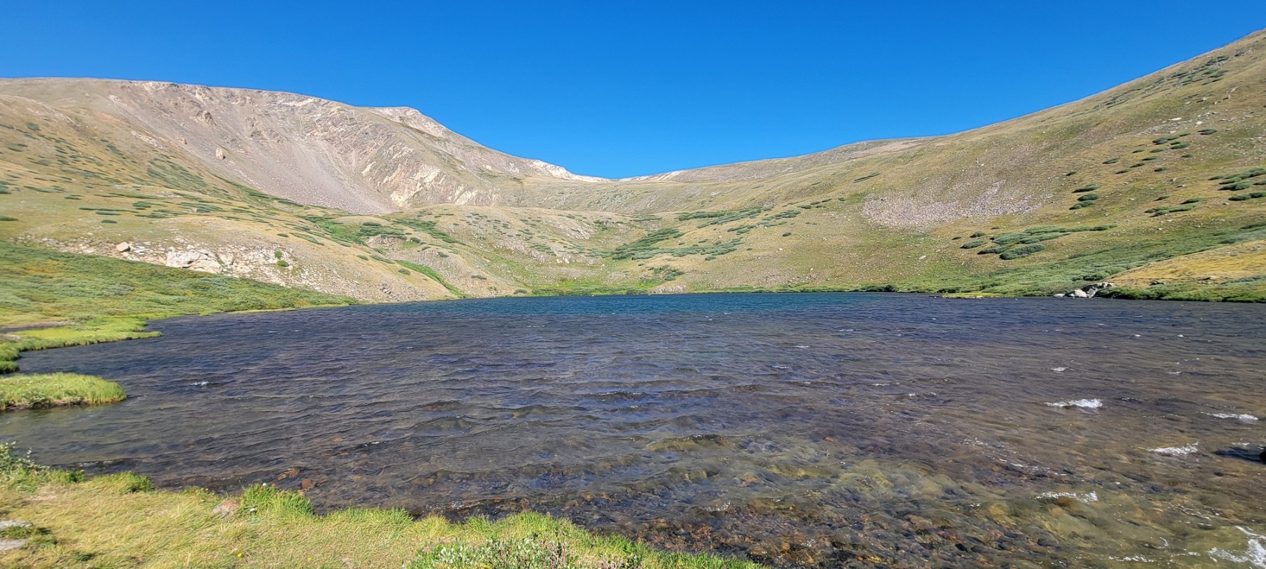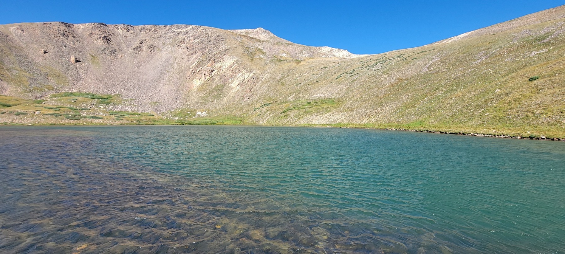 The lower lake is more of a rounded lake sitting beneath a ridge at the base of Square Top and Argentine mountains. The water is shallow close to where it can first be seen with a deeper section toward the back based on the change in water color. There isn’t much vegetation around the water, or trails to go around the lake but a few spots you can get pretty close. A close look at the picture above actually reveals some white caps on the waves due to the very strong winds this day.
