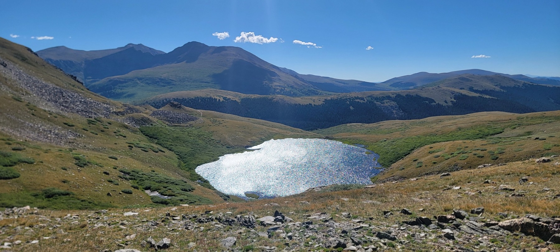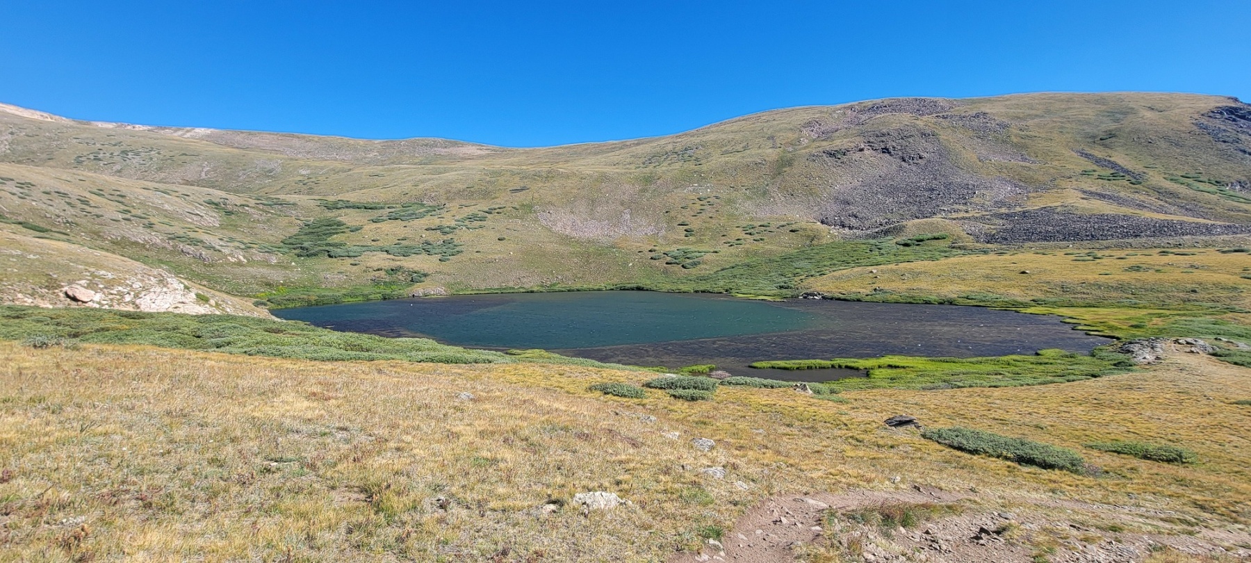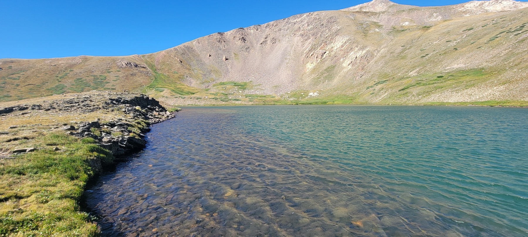 The lower lake is more of a rounded lake sitting beneath a ridge at the base of Square Top and Argentine mountains. The water is shallow close to where it can first be seen with a deeper section toward the back based on the change in water color. There isn’t much vegetation around the water, or trails to go around the lake but a few spots you can get pretty close. A close look at the picture above actually reveals some white caps on the waves due to the very strong winds this day.