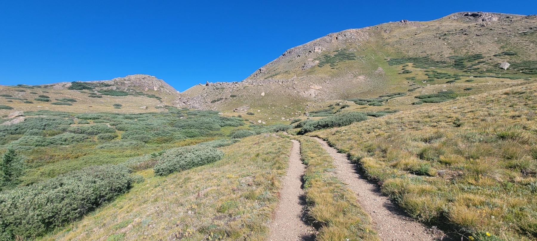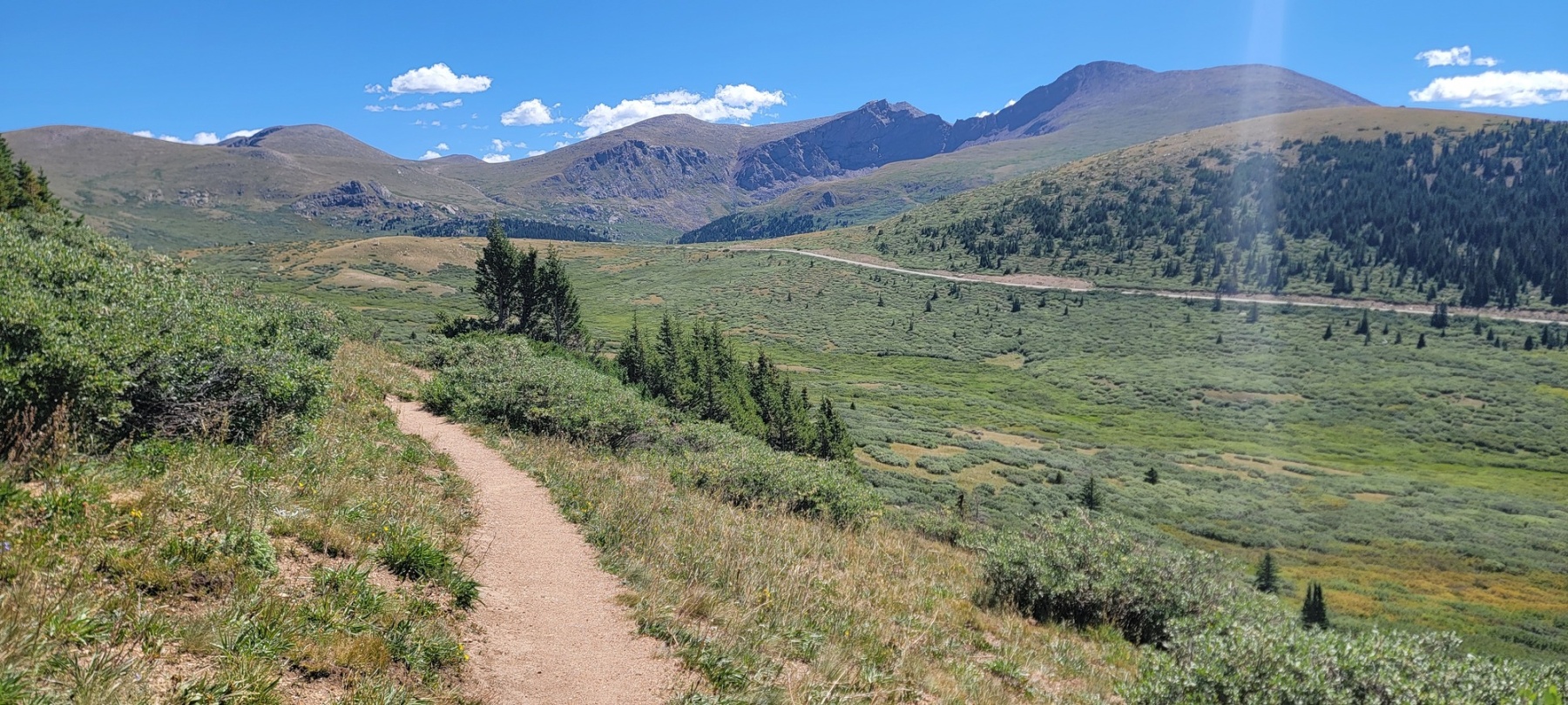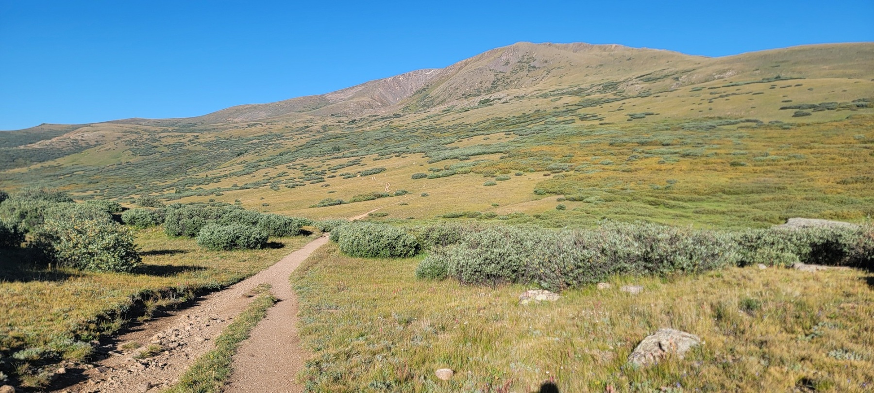 The Square Top Lakes trail begins with a really enjoyable walk through an open meadow. In fact, the majority of the hike is out in the open and exposed so make sure you are prepared with sun and weather protection. The open meadow to start this hike is just so grand. The views stretch in every direction. Bierstadt towers to the East and Square Top and Argentine Peaks bookend to the west with the open meadow sitting in between. It really is pretty special.