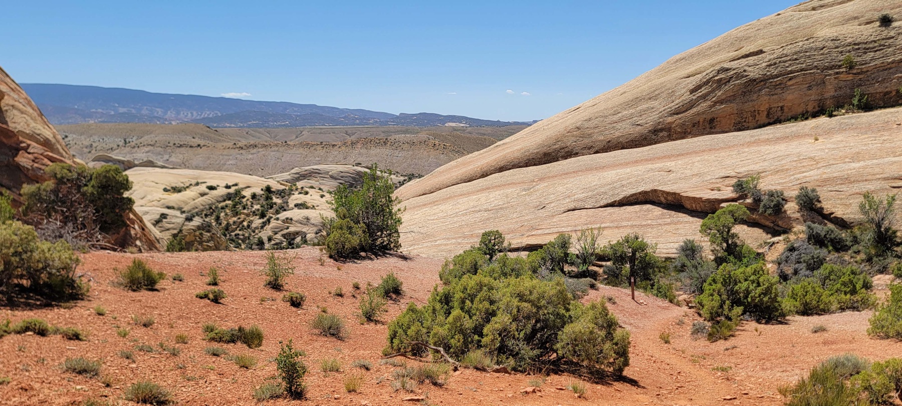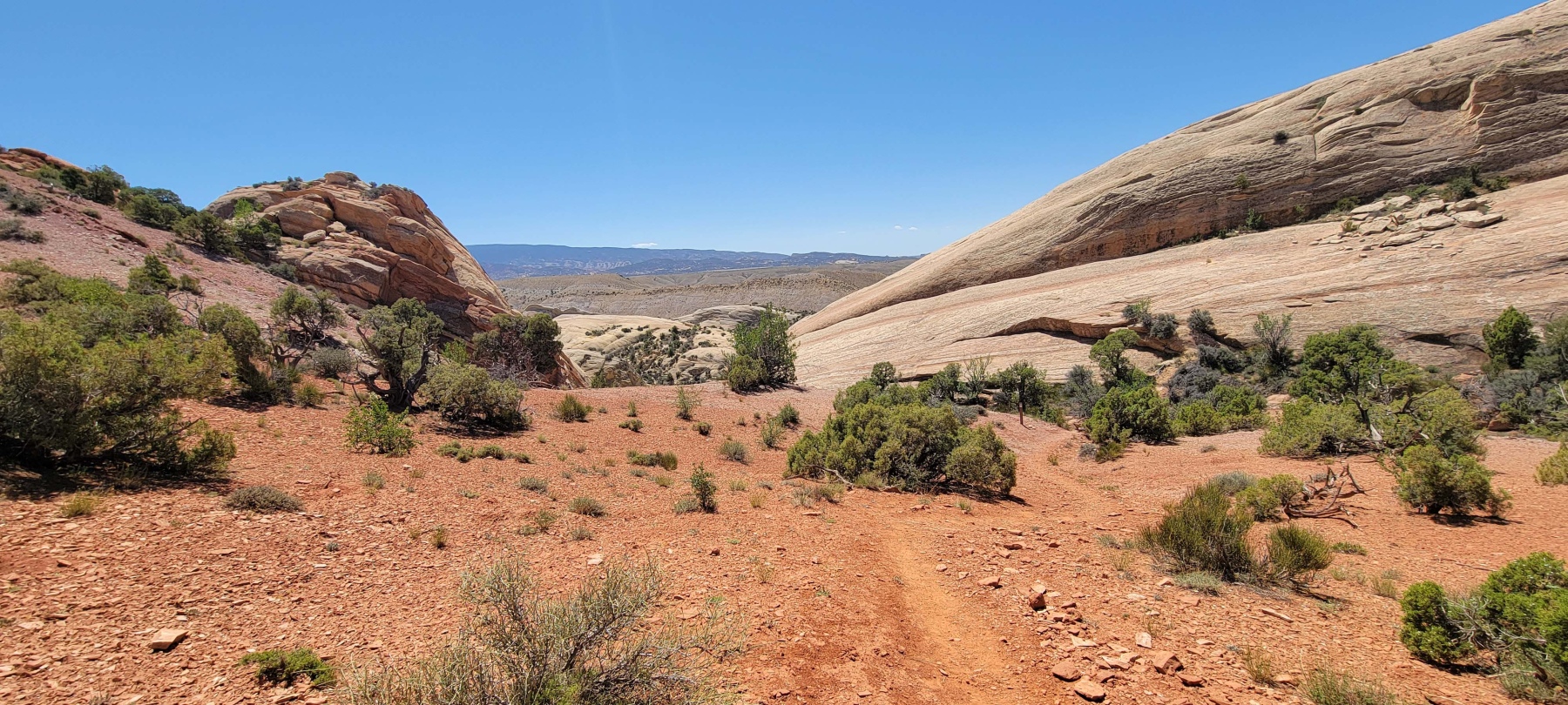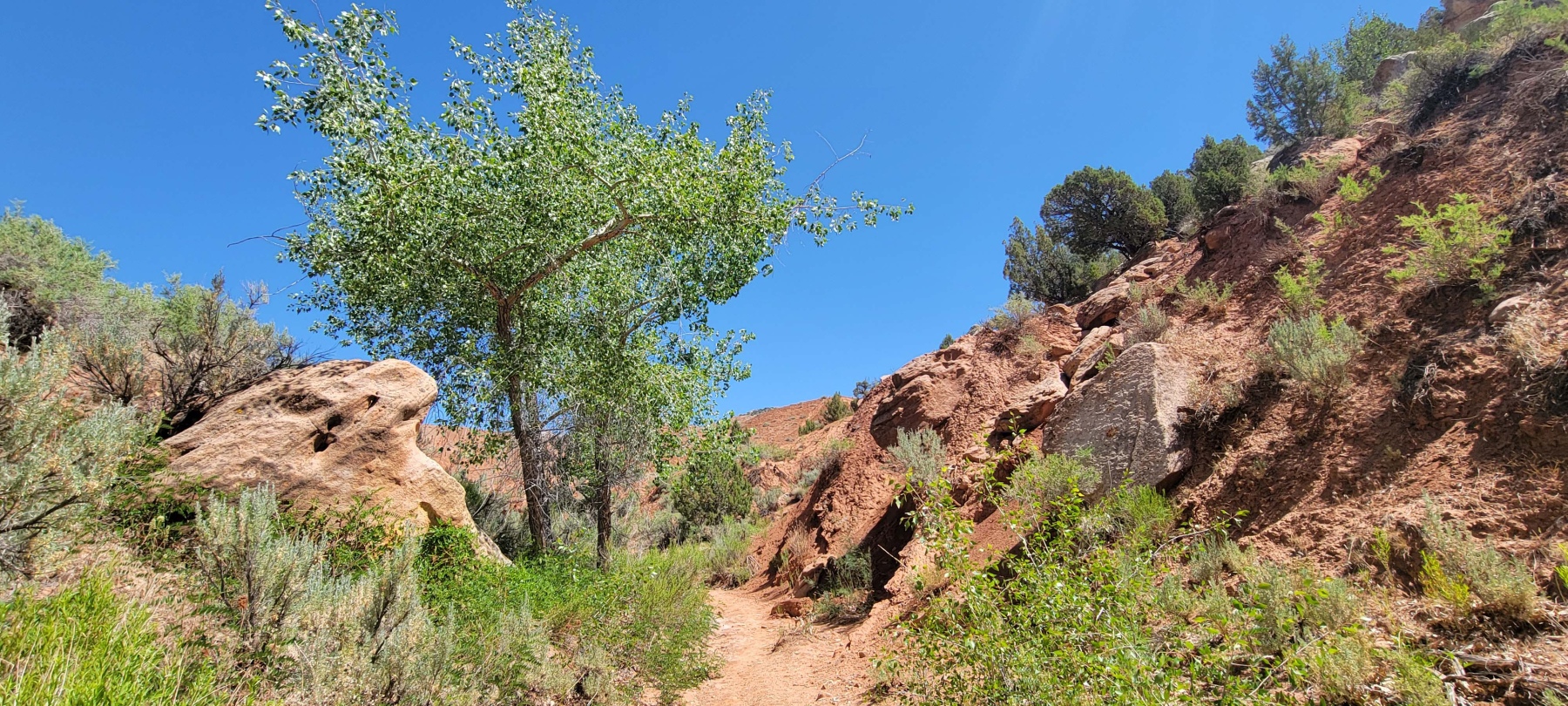 The lower rocky section last for about a mile. There is a constant gradual uphill but nothing I would consider steep until the end of the interior section. The rock formations in this section are really amazing. There are also some trees and bushes down near the wash area. About a mile into this little canyon, the trail leads you to the top level where the views definitely change.