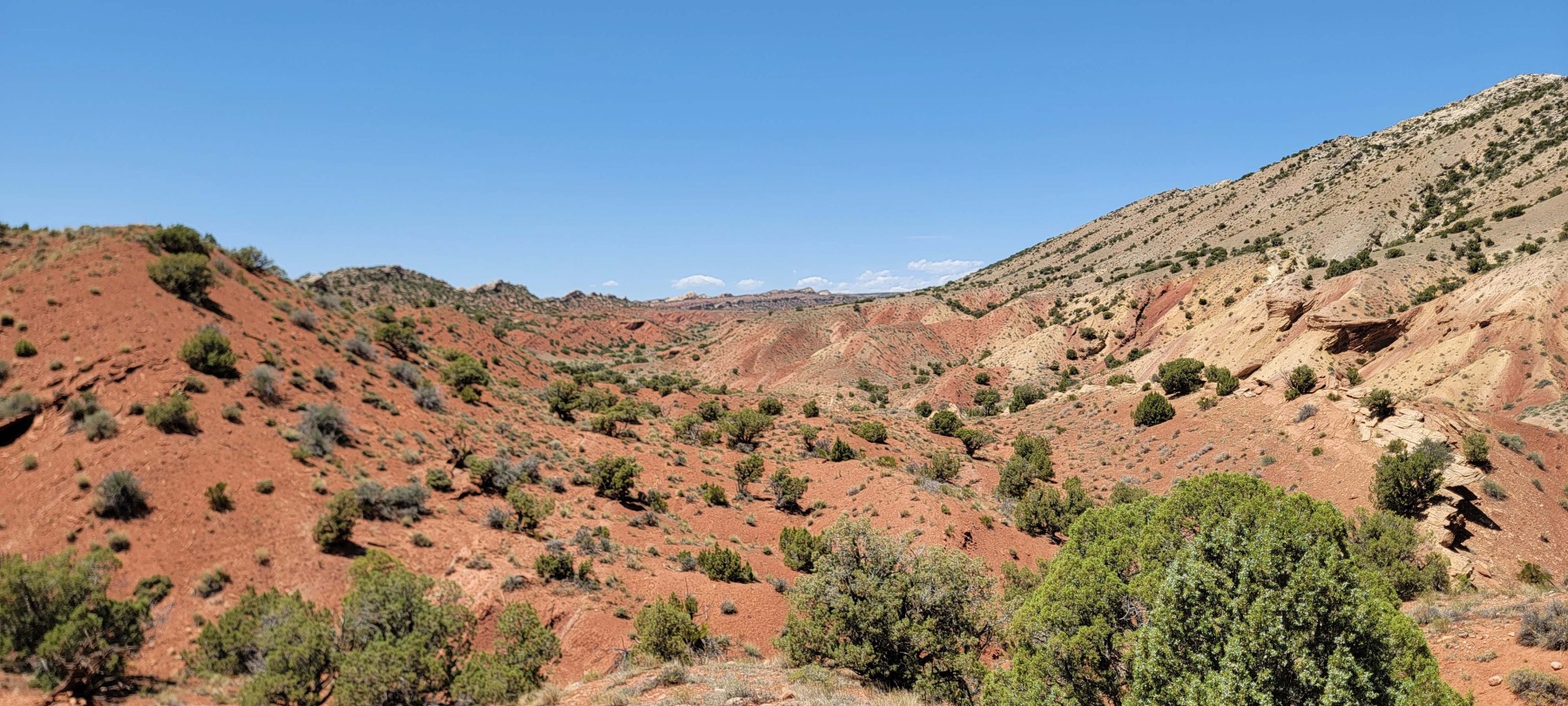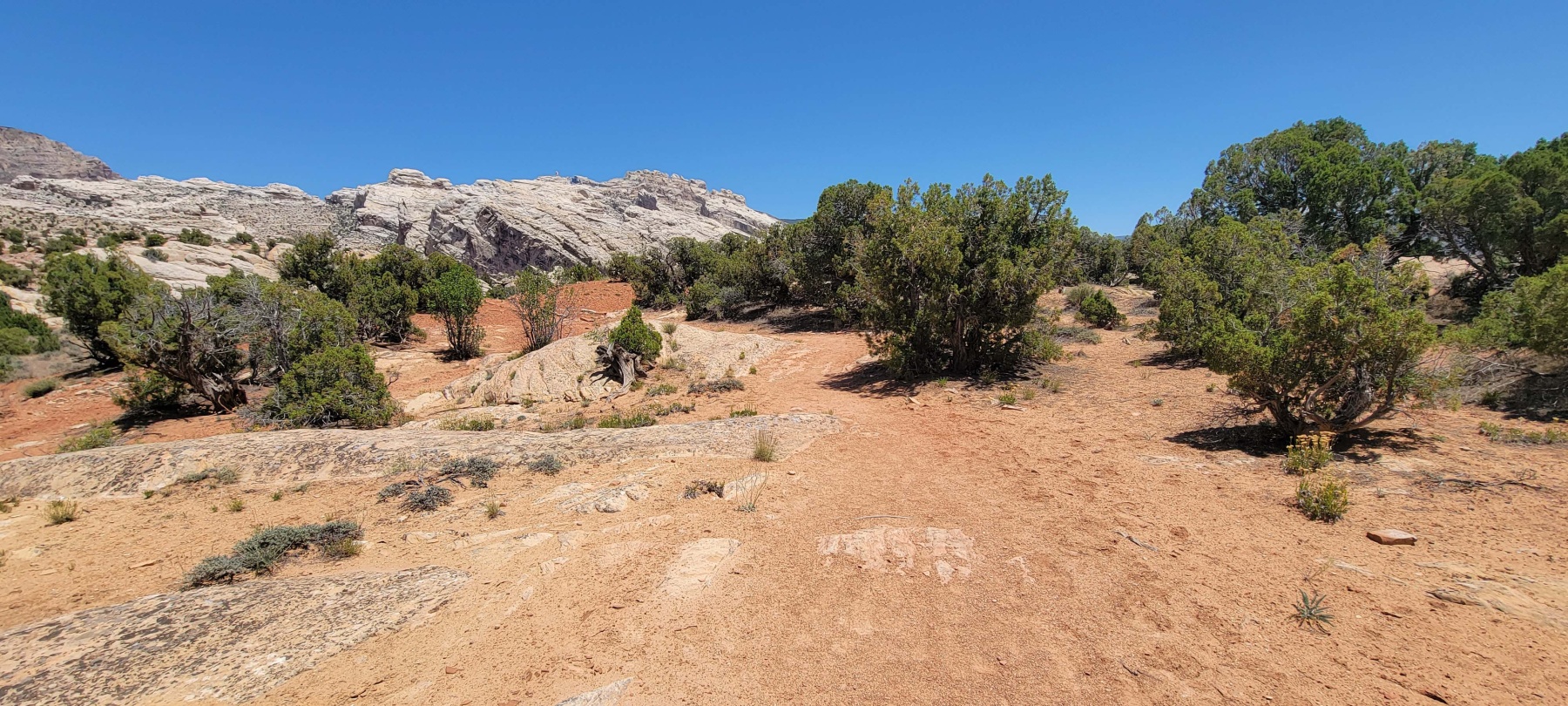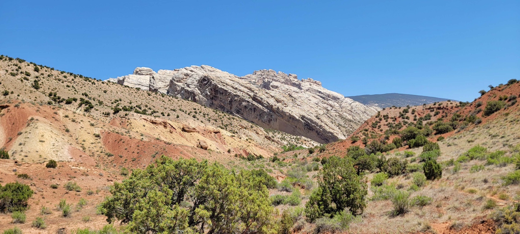 When it comes to the hike, there really isn’t anything to technical to deal with. The trail leads into a small wooded area into a wide open bowl with hills on either side. The lower hills are shaded red and white with small juniper trees pocking the landscape. The higher levels are white rock that stood out against the blue sky on a warm summer afternoon.