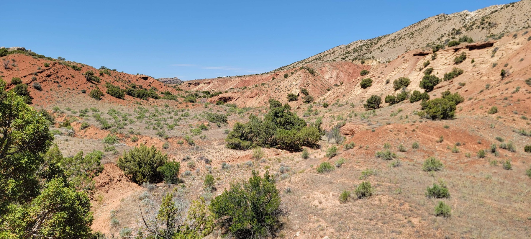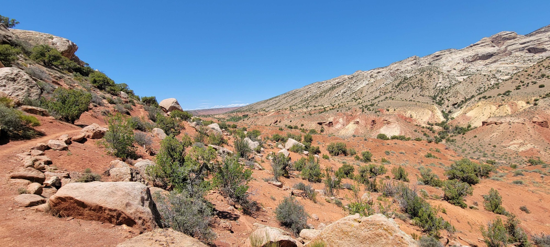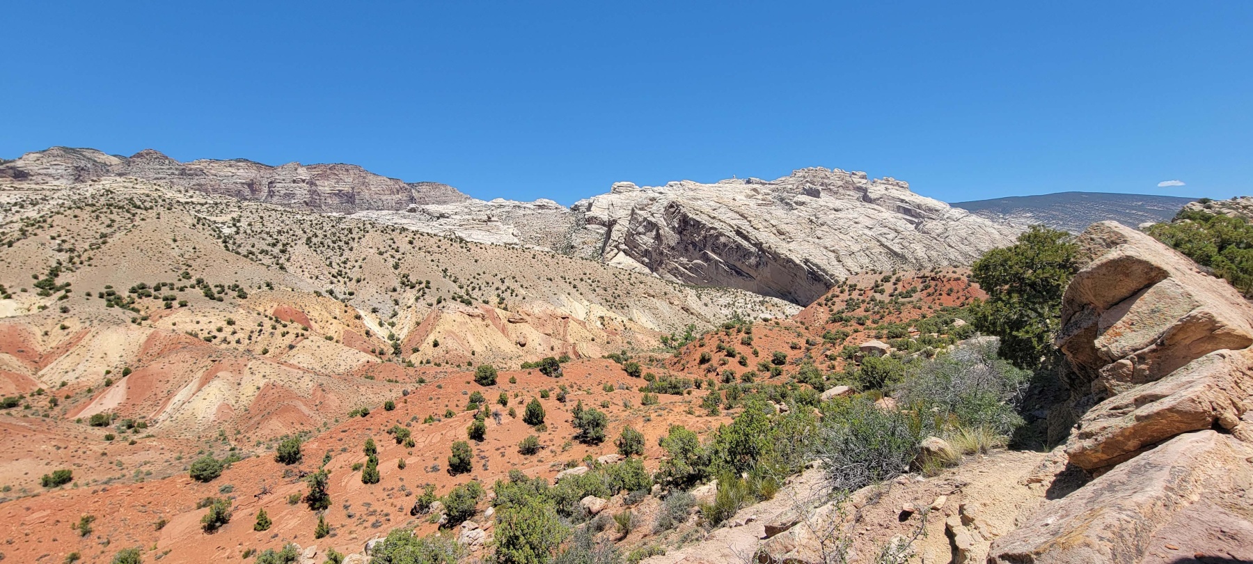 When it comes to the hike, there really isn’t anything to technical to deal with. The trail leads into a small wooded area into a wide open bowl with hills on either side. The lower hills are shaded red and white with small juniper trees pocking the landscape. The higher levels are white rock that stood out against the blue sky on a warm summer afternoon.