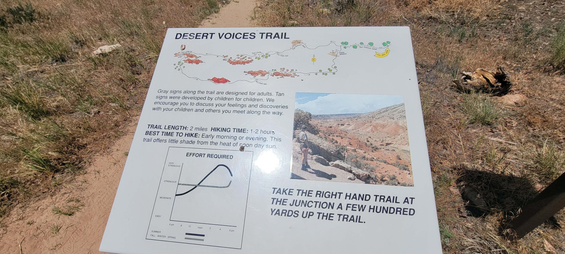 The Desert Voices Trail isn’t really that hard. It meanders through some open and hilly terrain in the desert. The distance and elevation aren’t very challenging. However, I am going to rate this as a moderate hike because of the exposure to the sun and heat that can be very challenging. I hiked in June and it was scorching, so if you aren’t prepared, you could find yourself in a lot of trouble. It could be very dangerous for anyone not hydrated or prepared for desert hiking. For those reasons, I have marked this as a moderately challenging hike.