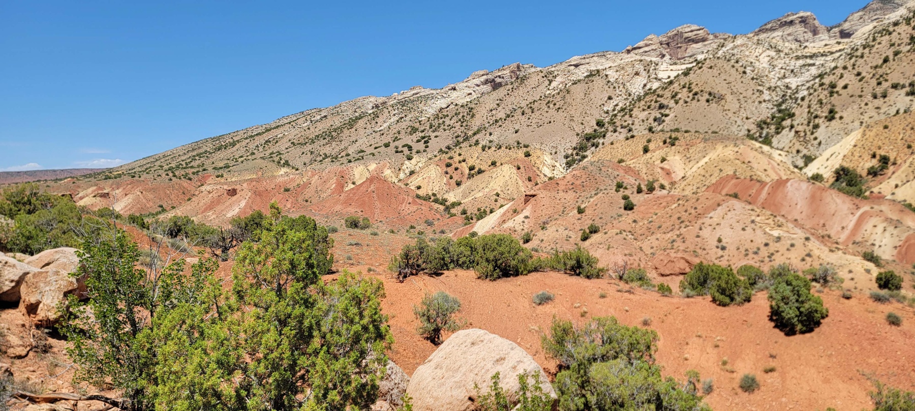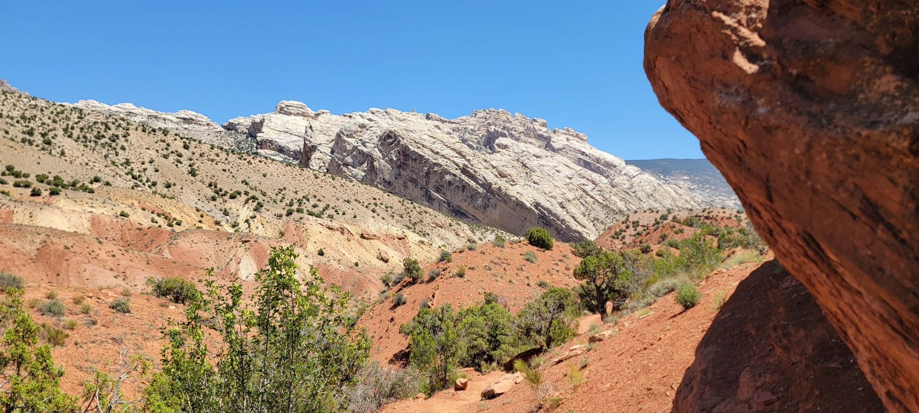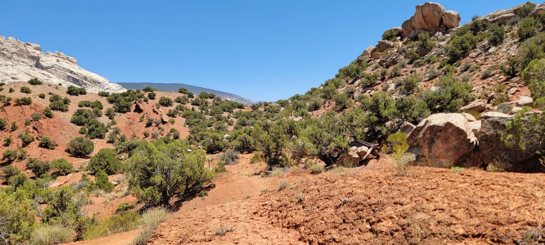 When it comes to the hike, there really isn’t anything to technical to deal with. The trail leads into a small wooded area into a wide open bowl with hills on either side. The lower hills are shaded red and white with small juniper trees pocking the landscape. The higher levels are white rock that stood out against the blue sky on a warm summer afternoon.