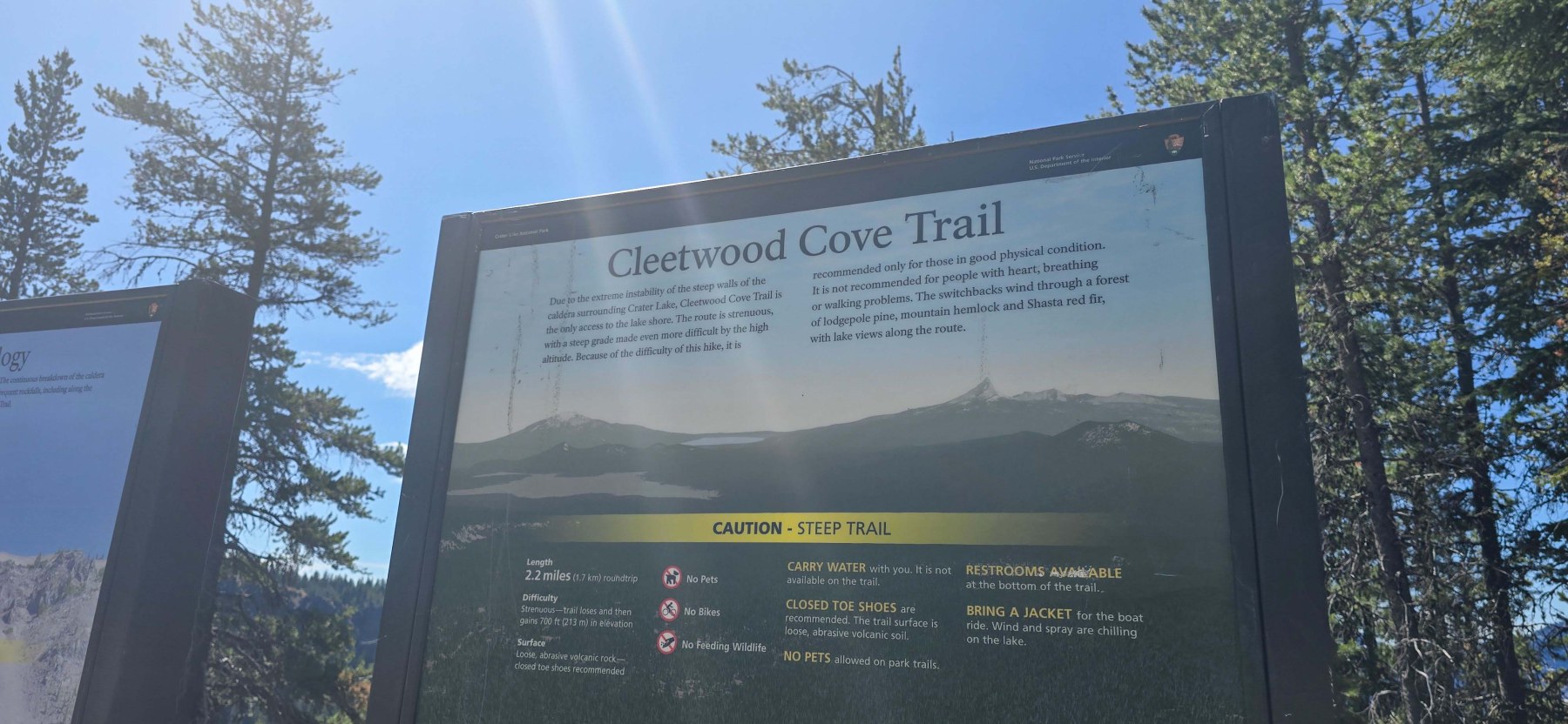 Warning that the Cleetwood Cove Trail will be closed for maintenance at the end of the 2025 season and isn’t scheduled to reopen until 2029. The trail is part of Crater Lake National Park. There is a daily use fee at the park. There is a large parking area with pit toilets at the trailhead.