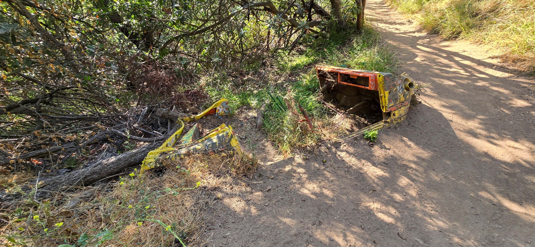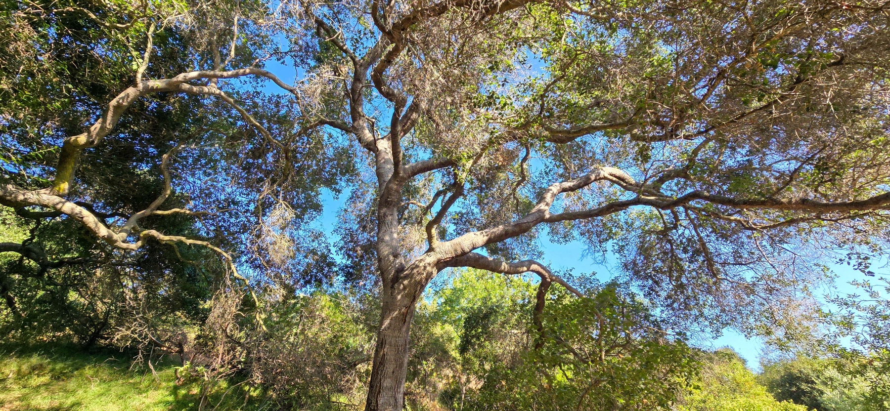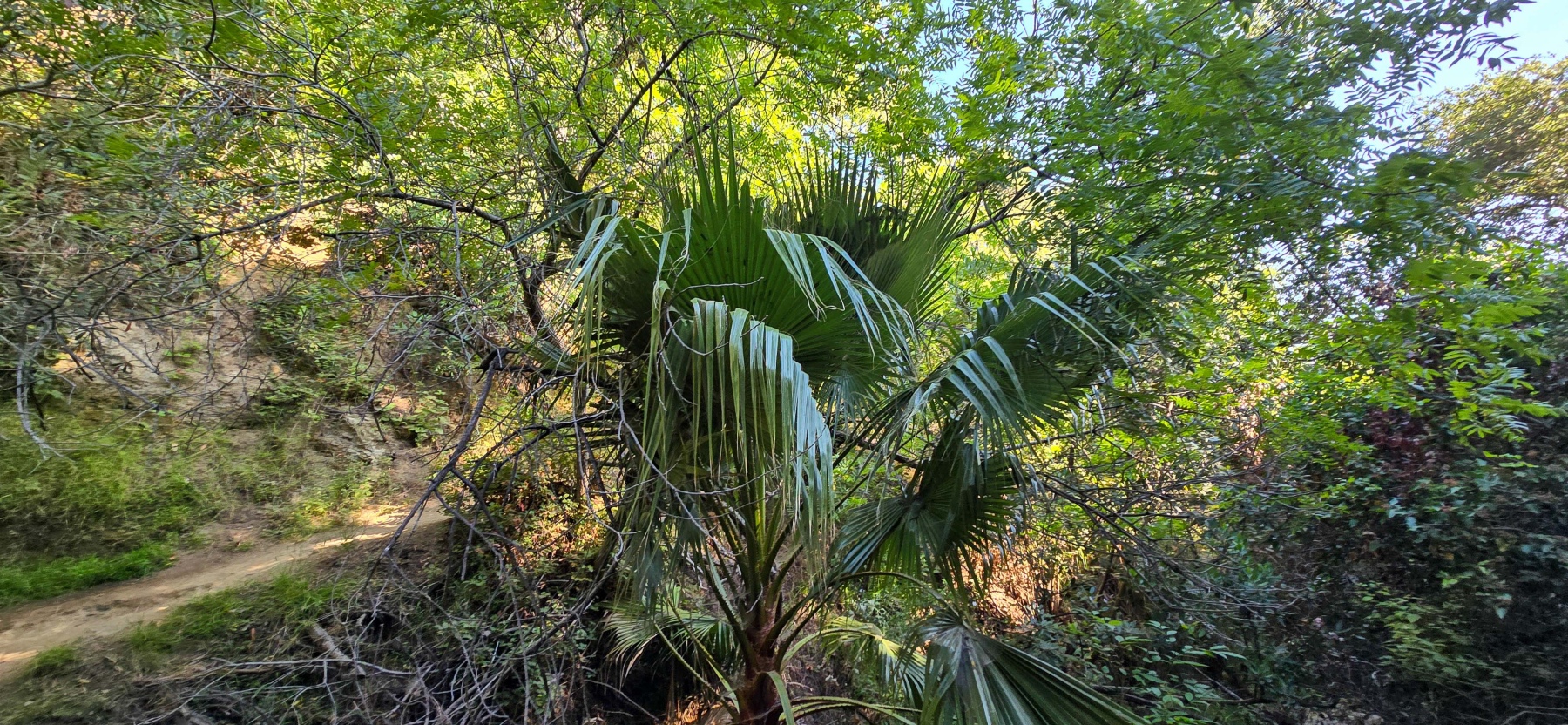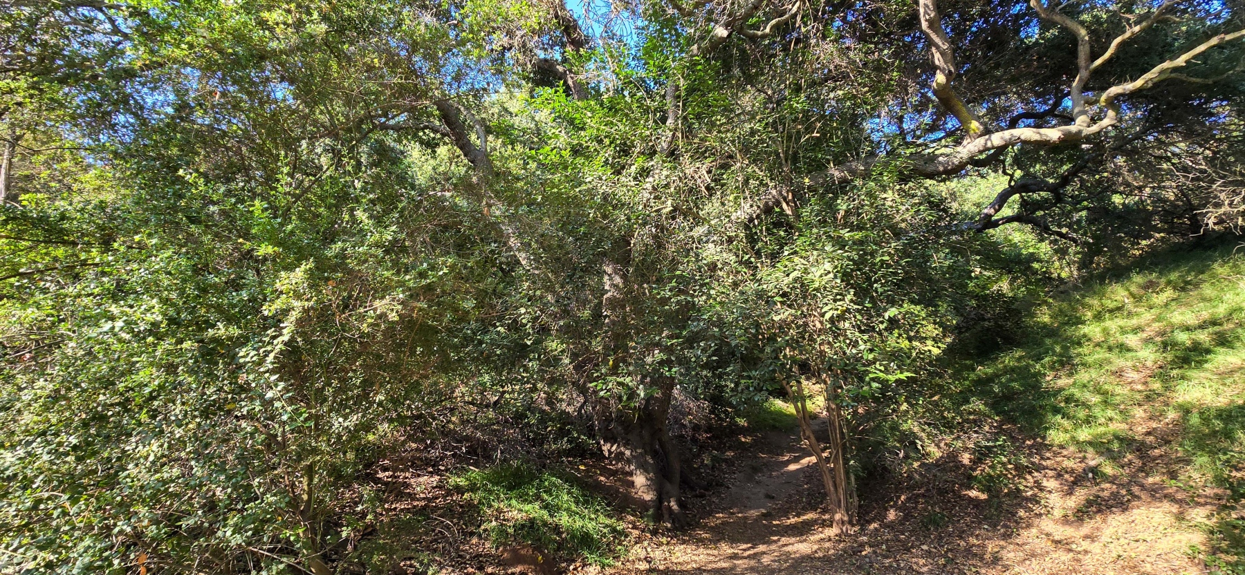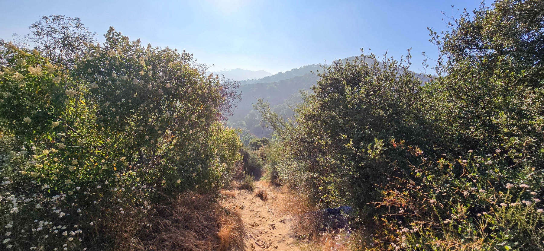 After the bench, the trail switchbacks its way back up the hill. This is much less elevation gain over the last seven-tenths of a mile. The switchback portion of the trail also has a lot of tree coverage and shade and one big surprise. On one of the switchbacks I was surprised to see the remains of an old van, which had been almost completely reclaimed by the earth but was definitely still visible, resting halfway down the canyon! A little above is a section of Mulholland called the “Dead Man Overlook” and