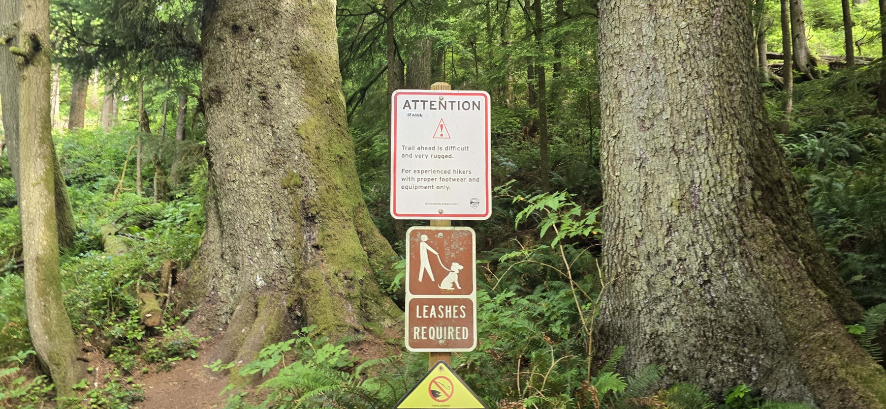 The trail takes you into a thick forest with alternating elevation gains and losses. It is close to the coast and was very humid when I hiked it. Also, the thick forest allowed for considerable overgrowth onto the trail. I would suggest long sleeves to keep the bugs and plant life away from your skin and shoes with good traction to deal with the damp inclines. Bug repellent might also be suggested as well as water and the rest of the ten essentials.