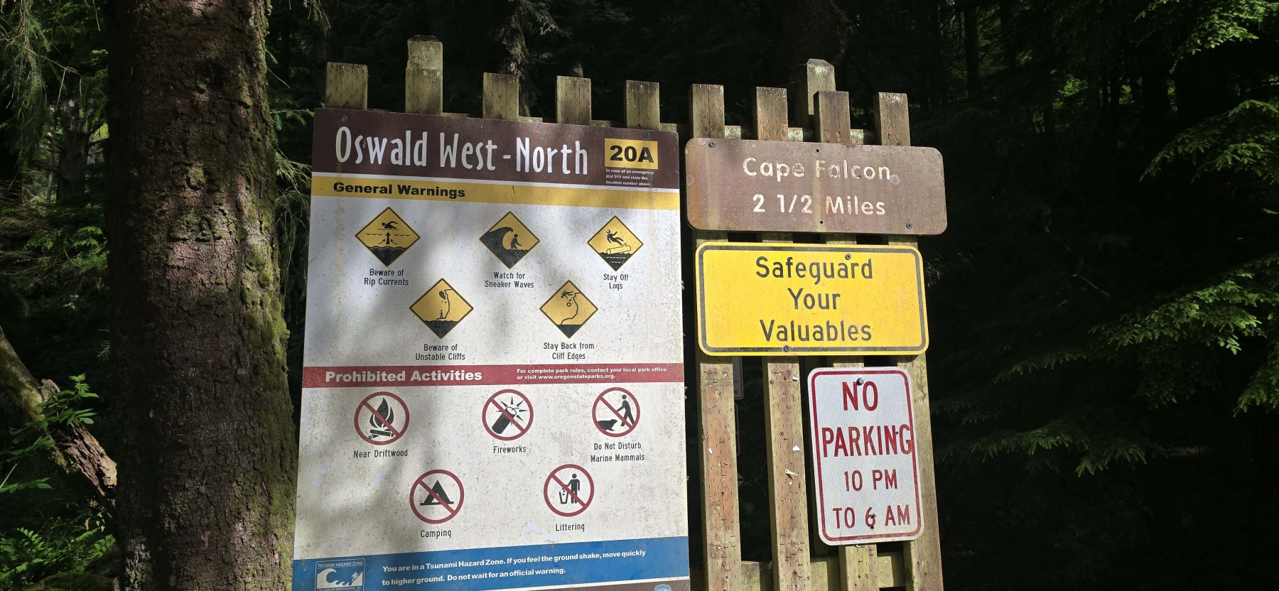 The Cape Falcon trailhead is located on the Oregon Coastal Highway, 101, south of Cannon Beach and north of Manzanita. There is room for about a dozen cars at the trailhead but no facilities. This is part of the Oregon State Park system and permit is required.