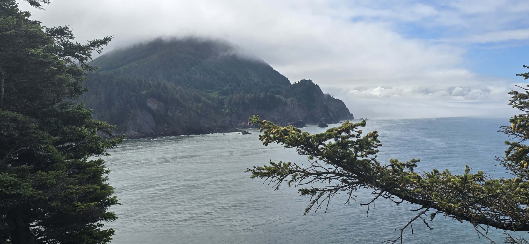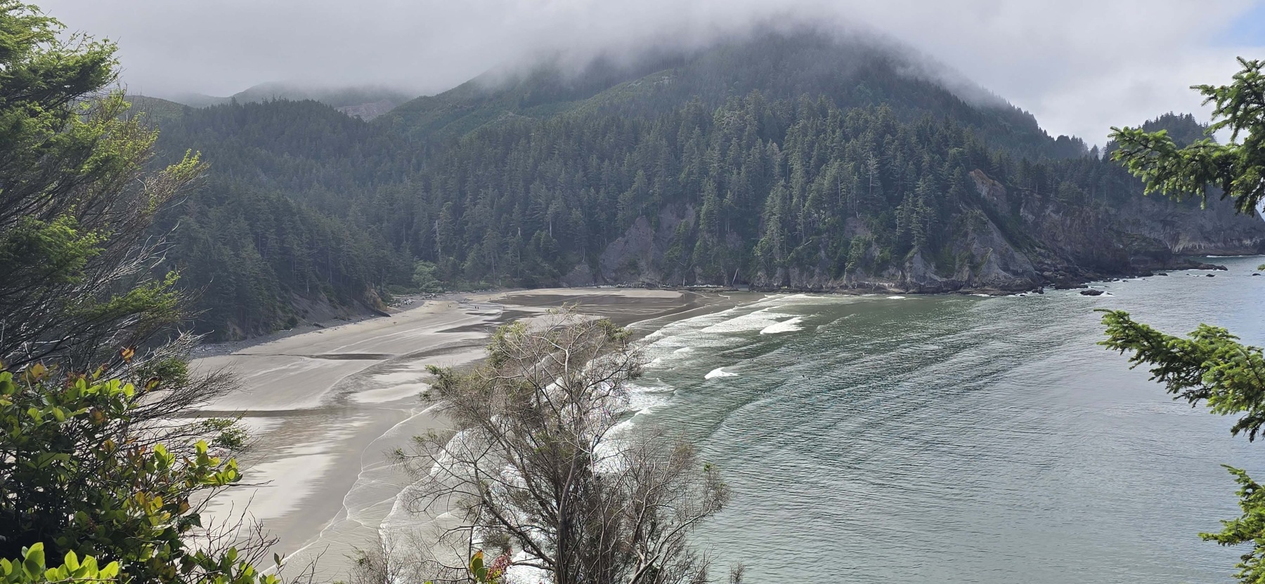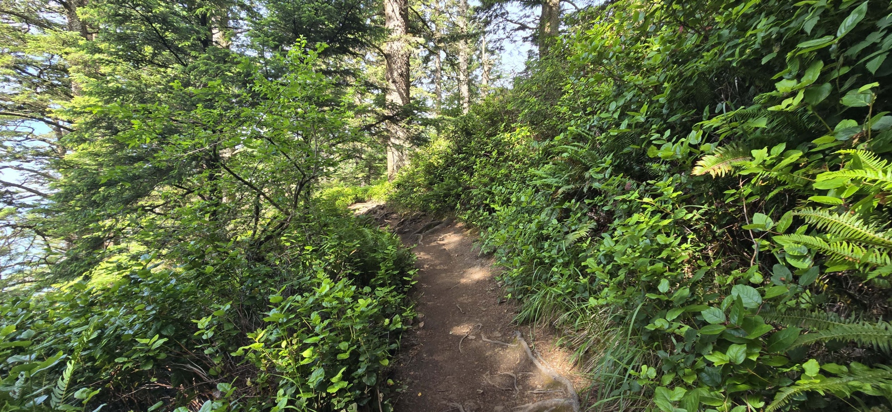 I come from a dry climate so I found the Cape Falcon hike to be really humid. Everything was damp and that included the trail that had a few sections that had mud that seemed to never really dry out. There are also several trees down that need to be cleared, especially through the first part of the hike. A lot of the growth has begun to grow close to the trail making some really narrow areas with a lot of having to brush against the plant life. Overall not bad but you may want to wear long sleeves and pants to protect from all of the plants.