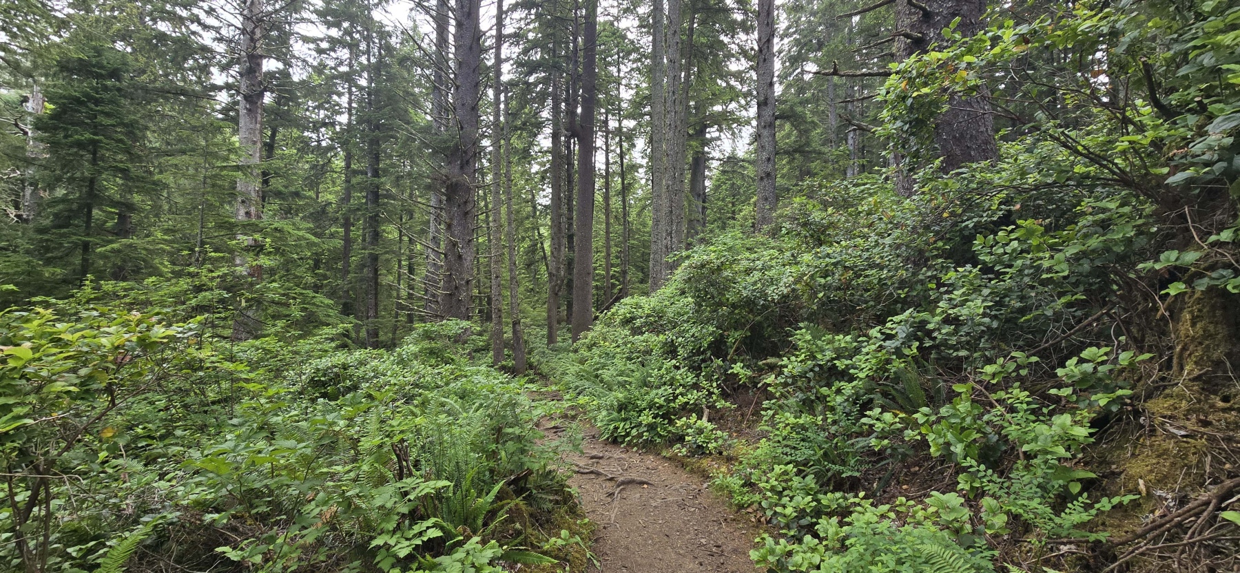 There were a few sections of heavier mud but for the most part, the trails were visible through the thick brush. There were quite a few bugs and I even saw my first ever banana slug, which was an experience. About a half mile in, the trail splits. To the right is the hike to Cape Falcon and to the left is a memorial and some day picnic sites. The hike to right heads back downhill and then up another hill but gives the first small views of the Pacific.